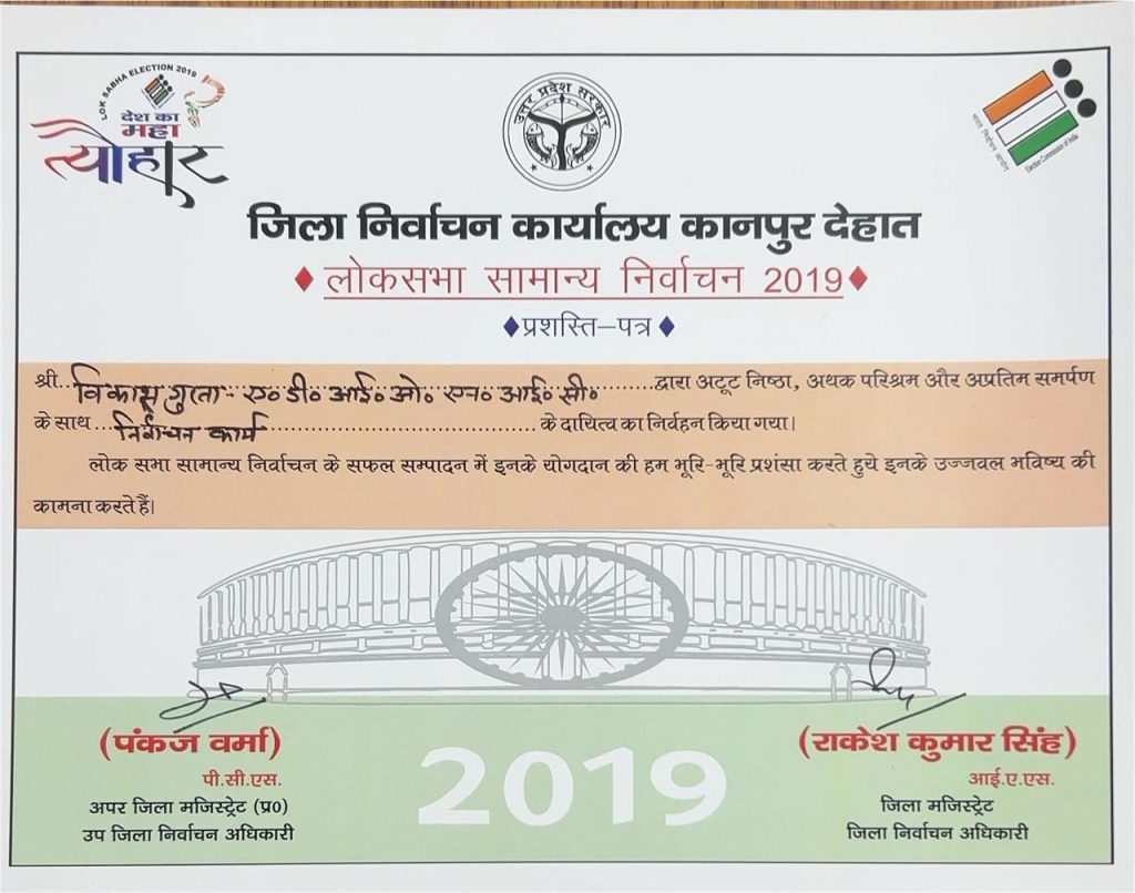 Appreciation for Lok Sabha General Election - Kanpur Dehat - 2019