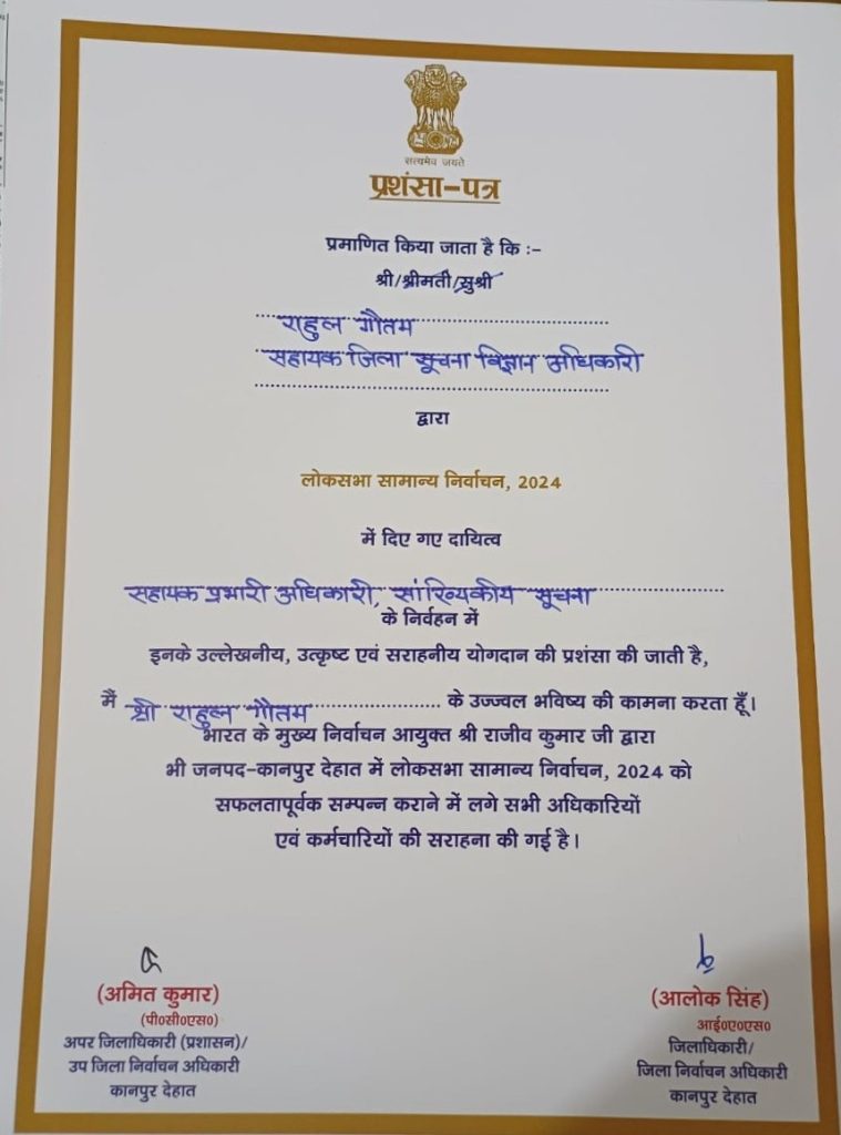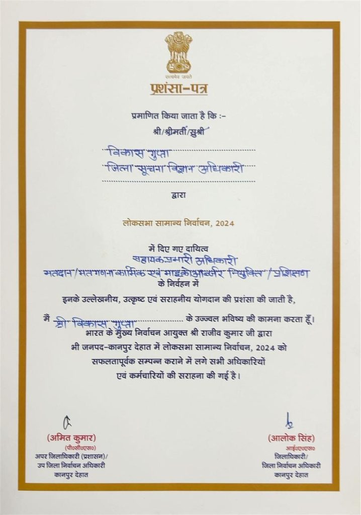 Appreciation for Lok Sabha General Election - Kanpur Dehat - 2024