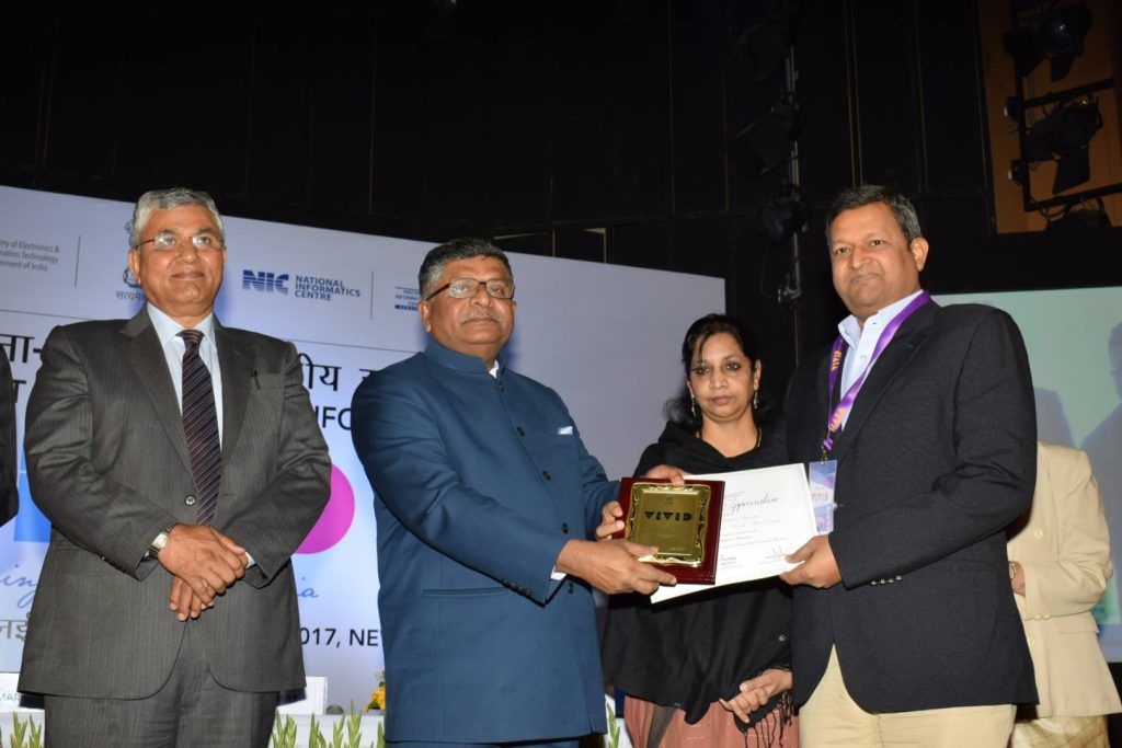 जनवरी 2017 में नई दिल्ली में आयोजित ग्रासरूट इन्फॉर्मेटिक्स पर प्रथम राष्ट्रीय डीआईओ सम्मेलन - विविड में कैशलेस लेनदेन को बढ़ावा देने के लिए बांदा, उत्तर प्रदेश को सर्वश्रेष्ठ डीआईओ पुरस्कार / Best DIO Award to Banda, Uttar Pradesh for Promoting Cashless Transactions at VIVID - 1st National DIO Meet on Grassroot Informatics, New Delhi, January 2017.