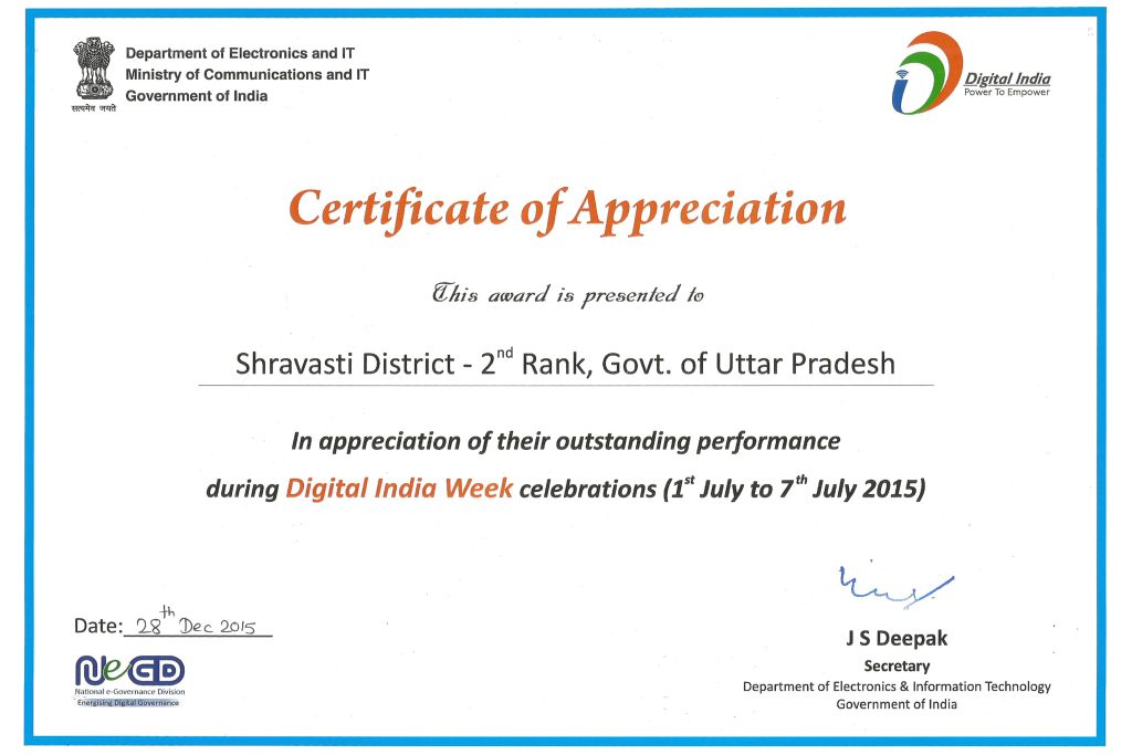 डिजिटल इंडिया अवॉर्ड 2015, जिला श्रावस्ती को, डिजिटल इंडिया वीक 2015 में उत्कृष्ट प्रदर्शन हेतु – प्रमाणपत्र / Digital India Award 2015 to district Shravasti for outstanding performance during Digital India Week 2015 - Certificate