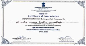 इलेक्ट्रॉनिकी और सूचना प्रौद्योगिकी मंत्रालय एवं राष्ट्रीय सूचना विज्ञान केंद्र (एन.आई.सी.) के द्वारा दिनांक 27.03.2026 को स्कोप कन्वेंशन सेंटर, सीजीओ कॉम्प्लेक्स, नई दिल्ली में हिंदी तकनीकी कार्यशाला/संगोष्ठी का आयोजन किया गया। इसके अंतर्गत ब्लॉक-चेन प्रौद्योगिकी में श्री आशेष अग्रवाल, उपमहानिदेशक एवं राज्य सूचना विज्ञान अधिकारी, उ.प्र. द्वारा प्रस्तुत आलेख “ब्लॉकचेन तकनीक: वित्तीय सेवाओं के लिए एक दिशा परिवर्तक” का चयन हुआ। इस आलेख को पुरस्कृत किया गया। इस अवसर पर श्री अग्रवाल द्वारा नामित अधिकारी श्री राजेश कुमार त्रिपाठी, व. निदेशक (आई.टी.) द्वारा पुरस्कार प्राप्त किया गया।